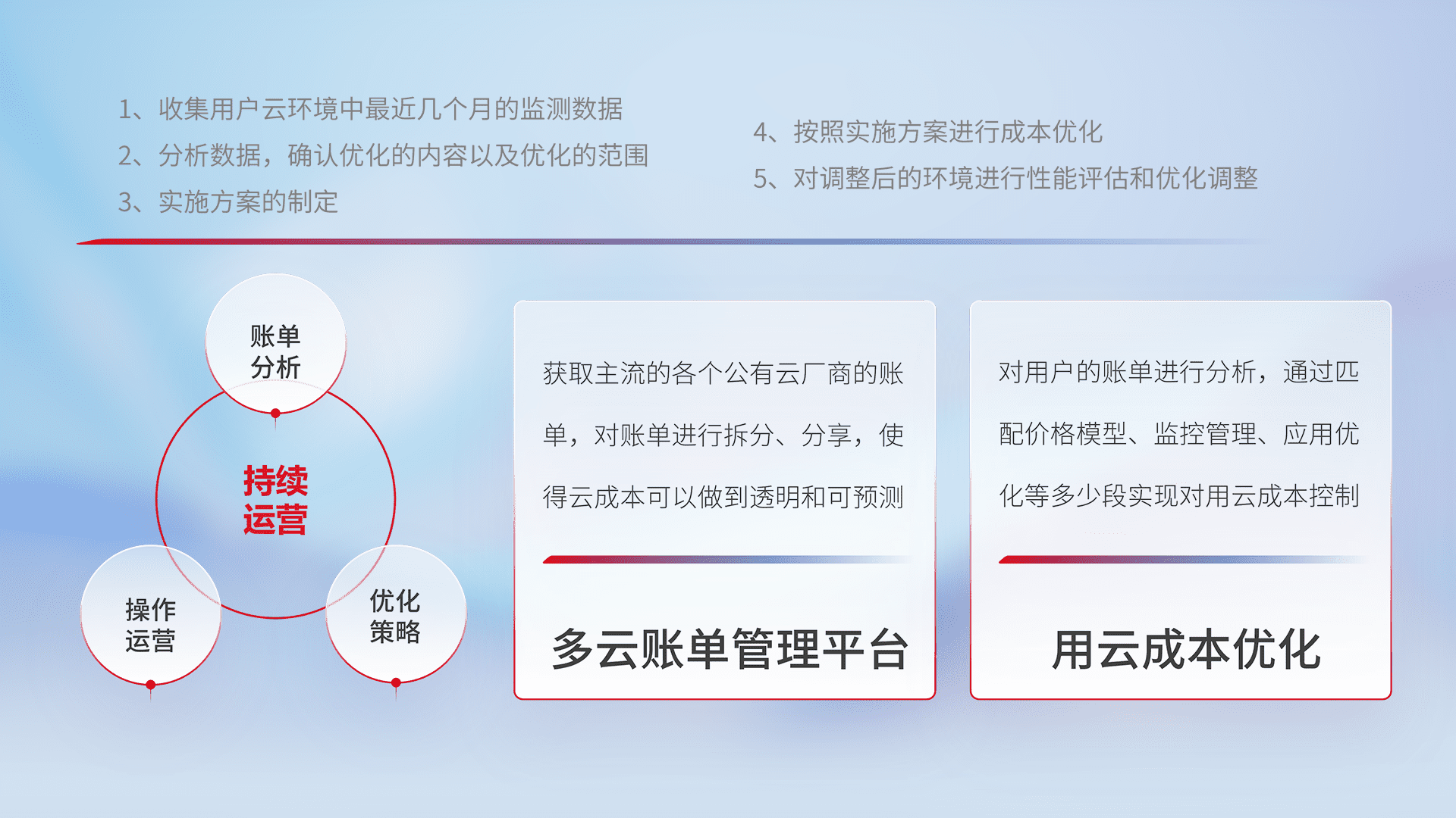 通过多云纳管,,,,以统一的资源数据模型把客户的云资源进行抽象和封装,,,进而实现对多云资源的统一操作,,,,保障云资源管理的可靠性、、、、稳定性与可用性。。量身定制化运维内容,,,配置、、开发运维、、补丁管理、、备份、、监控、、、认证和访问管理、、、、审计和日常巡检等,,,保障在用云过程中的可靠度,,稳定度以及高可用率。。。。