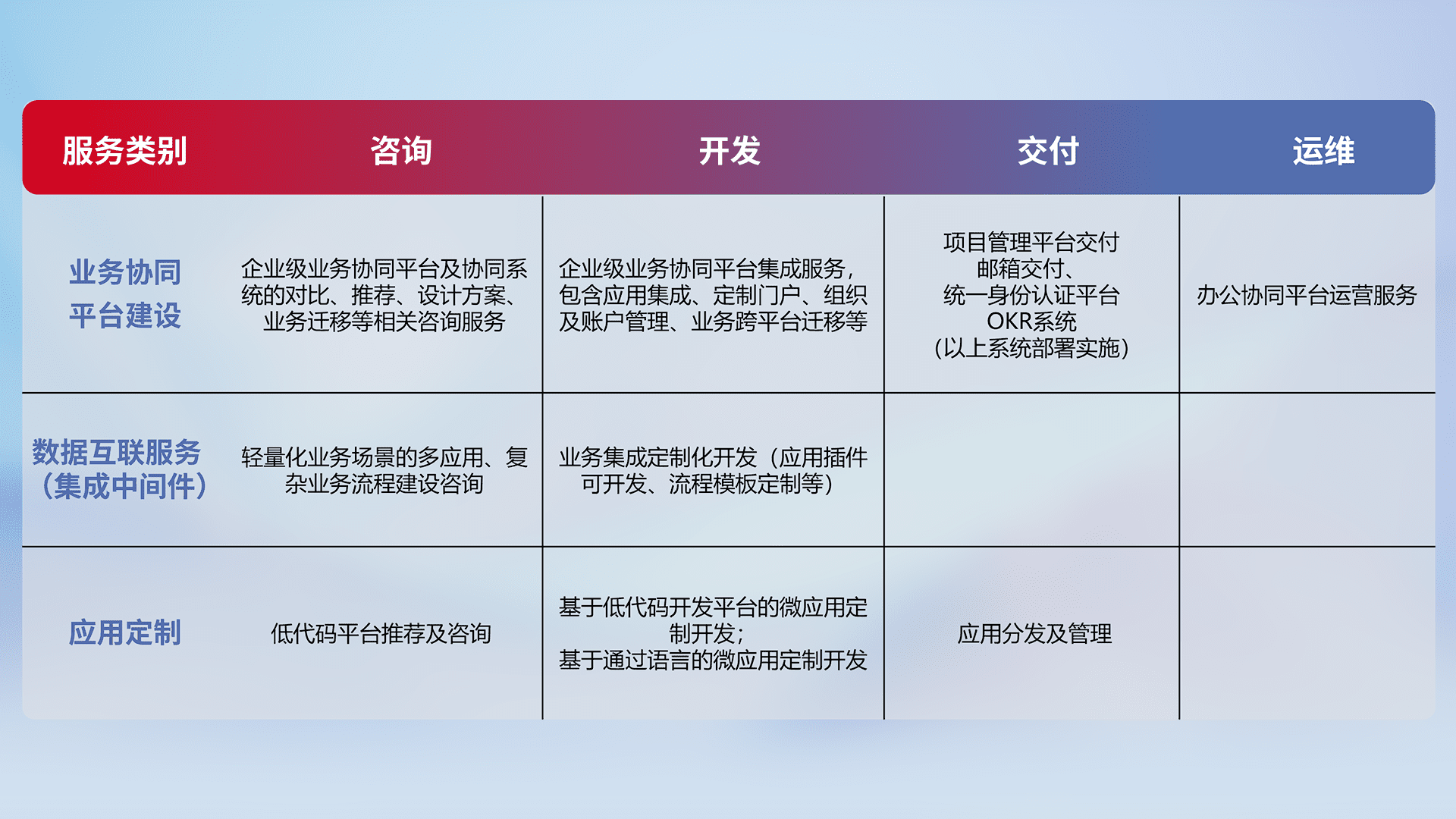 针对钉钉、、、、企微、、IDaas等平台级产品提供产品的规划、、、、方案、、交付、、定制化开发等服务,,,实现如统一协同办公、、、智能客户服务、、、混合会议管理、、、智能数据查询、、等业务场景,,,,实现数字化转型。。。。
